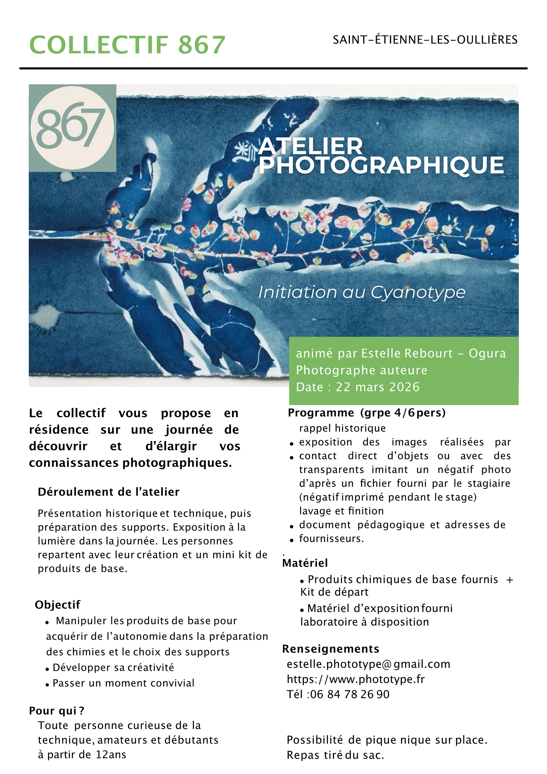 Un atelier Cyanotype est programmé le 22 mars 2026. Il est complet